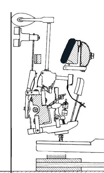 Die Stoßzunge ruht gegen das Hammernusspolster und unter dem Hammernussleder. In dieser Position wird sie durch eine Spiralfeder gehalten.